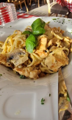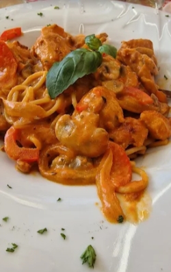 tomatensaus, roomsaus, kip, ui, paprika, champignons