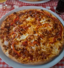 tomatensaus, kaas, kip, ui, paprika, mozzarella, bbqsaus
