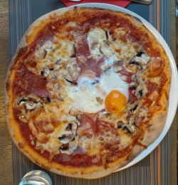 tomatensaus, kaas, ham, salami, ei, champignons
