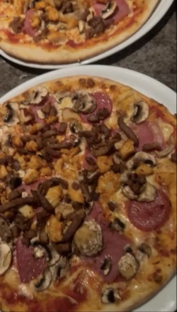 tomatensaus, kaas, shoarma, champignons, ui, paprika